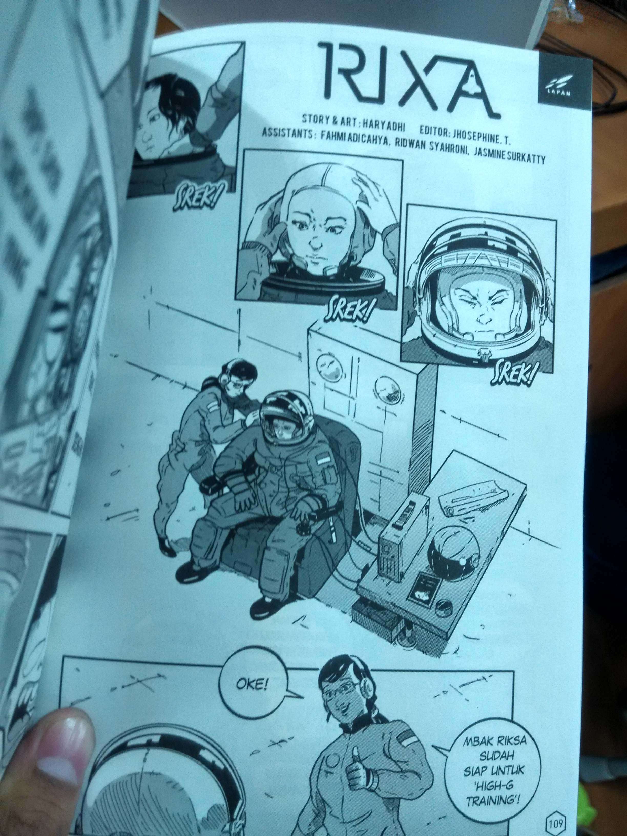 Dalam bab terbaru komik Rixa ini, pembaca akan diajak berkeliling melihat suasana pelatihan astronot yang dijalani oleh Riksa. Banyak hal-hal seputar pusat penelitian antariksa yang ditampilkan di komik ini mulai dari kostum yang harus dikenakan astronot, serta alat pelatihan High-Gravity Training yang digambarkan dengan cukup detail. Namun unsur drama yang ada pada bab pertamanya masih tetap dibawakan ke komiknya di Kosmik Mook volume ke-2 ini. Penggunaan alur maju-mundur dalam penceritaan mampu mengemas muatan kisah drama di komik ini dengan cukup apik.