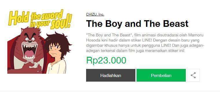 Stiker The Boy and The Beast ini sudah bisa dibeli oleh para pengguna Line di Indonesia. Cukup akses Line Sticker Shop, maka pengguna bisa menemukan stiker seharga Rp23.000 atau 100 Line Coin ini. Stiker ini tidak hanya menampilkan para karakter di film nya saja namun juga ada beberapa adegan khas di film The Boy and The Beast yang diangkat menjadi stiker. Berikut ini adalah tampilan stiker Line ini: