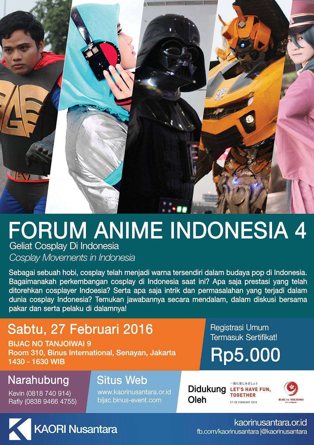 Acara diskusi ini akan diselenggarakan pada Sabtu, 27 Februari 2016 dalam perhelatan BIJAC no Tanjouiwai 9 di Binus International, Senayan, Jakarta Selatan.