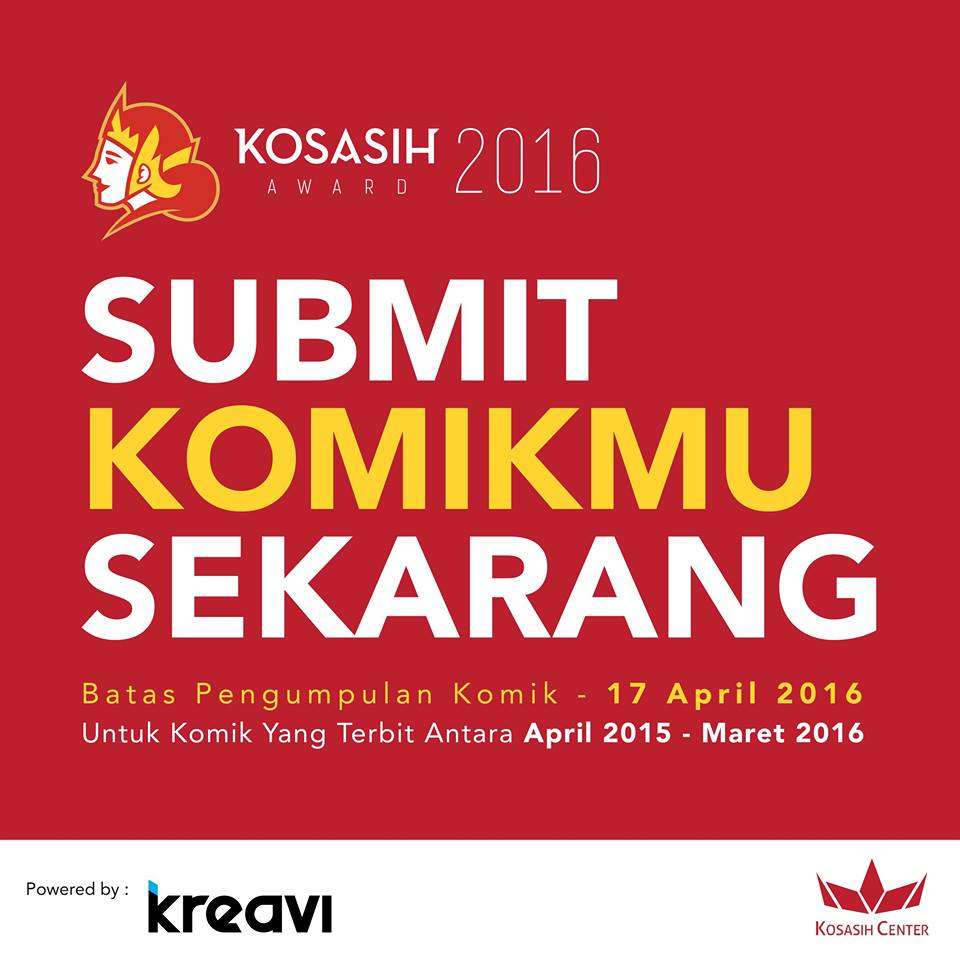 Untuk Komik yang terbit secara online bisa mengirimkan file nya dalam bentuk pdf atau jpeg dengan subjek : Kosasih Award 2016, ke email : [email protected]
