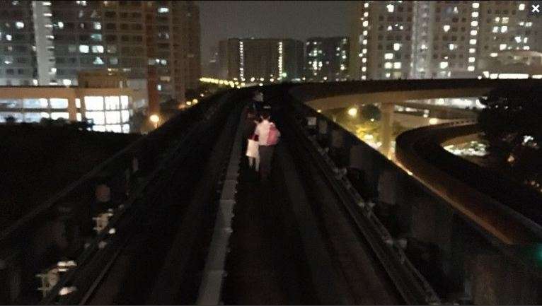 Beberapa orang penumpang di salah satu rangkaian kereta api ringan atau Light Rail Transit (LRT) SBS Transit, Singapura terpaksa berjalan kaki menerobos kegelapan jalur rel layang. Para penumpang ini terpaksa keluar dari kereta karena terjadi masalah di kereta yang mereka naiki. Peristiwa ini terjadi di Sengkang, Singapura pada Selasa malam (29/3).