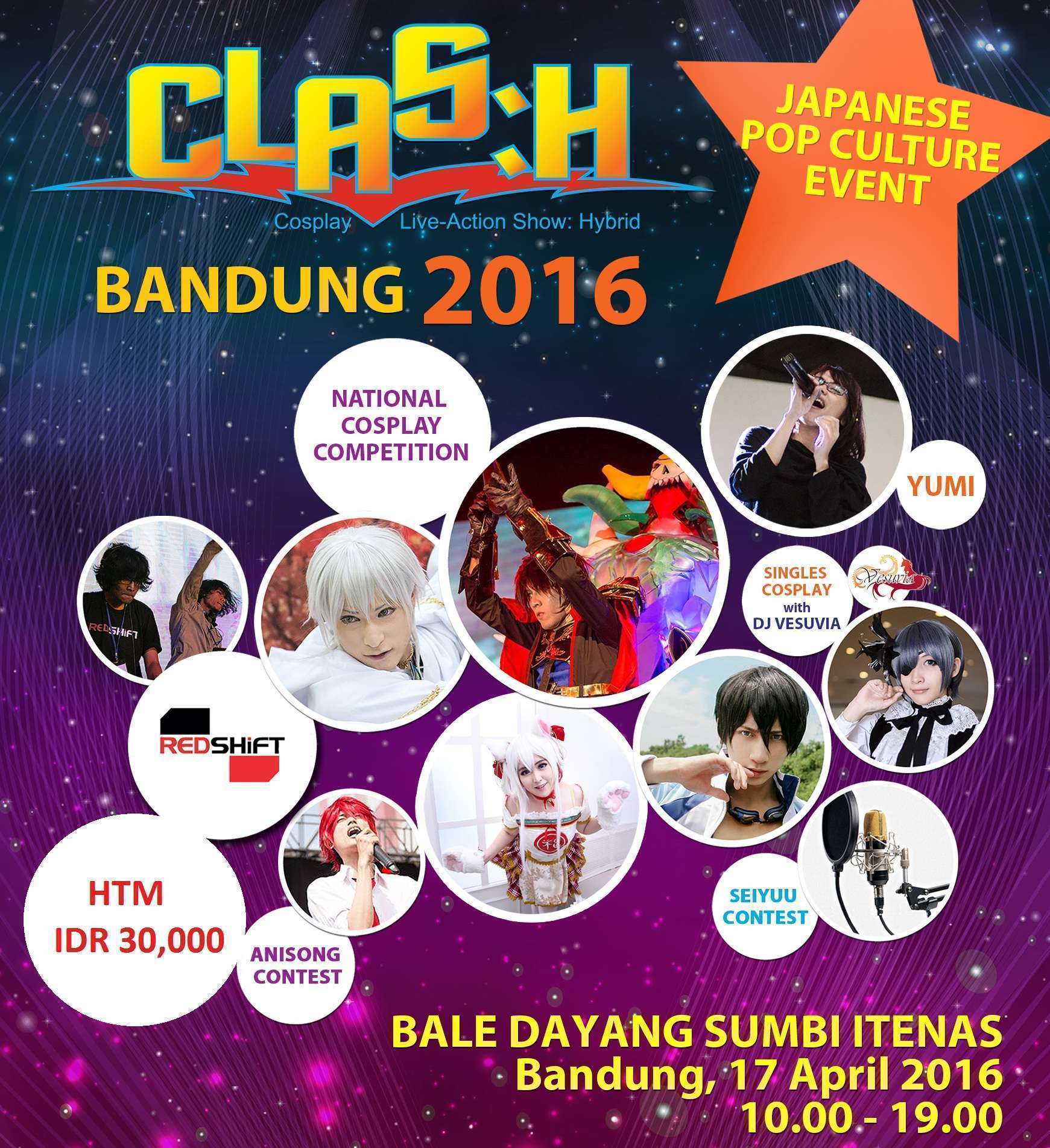Sebelum sampai Final CLAS:H di POP- CULTURE ENNICHISAI 2016 bulan mei nanti. Minggu 17 April ini, CLAS:H akan hadir di Bale Dayang Sumbi Itenas, Bandung pukul 10.00-19.00 dengan Harga Tiket OTS Rp. 30.000. Acara ini akan dimeriahkan oleh: National Cosplay Competition, Anisong Contest, Seiyuu Contest, Single cosplay with Dj Vesuvia, Cosplay Kabaret dari Cosplayer Jogja, Yumi Akimoto dan Red Shift. Tidak hanya itu, peserta juga akan mendapatkan pengalaman seru dari para juri yang akan hadir, yaitu Yaman, Wawa, Konnichi, Sandy dan Dimas.