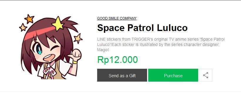 Dan kali ini seri anime ini turut serta hadir dalam aplikasi perpesanan instan Line dalam bentuk stiker. Stiker dari seri anime Space Patrol Luluco ini menampilkan aksi dari para karakter seperti Luluco, Alpha Omega Nova, serta kepala polisi antar galaksi, Over Justice yang siap mewarnai chat anda. Stiker ini dapat diperoleh hanya dengan 50 line coin atau seharga Rp12.000. Stiker ini juga sudah bisa dibeli di Indonesia.