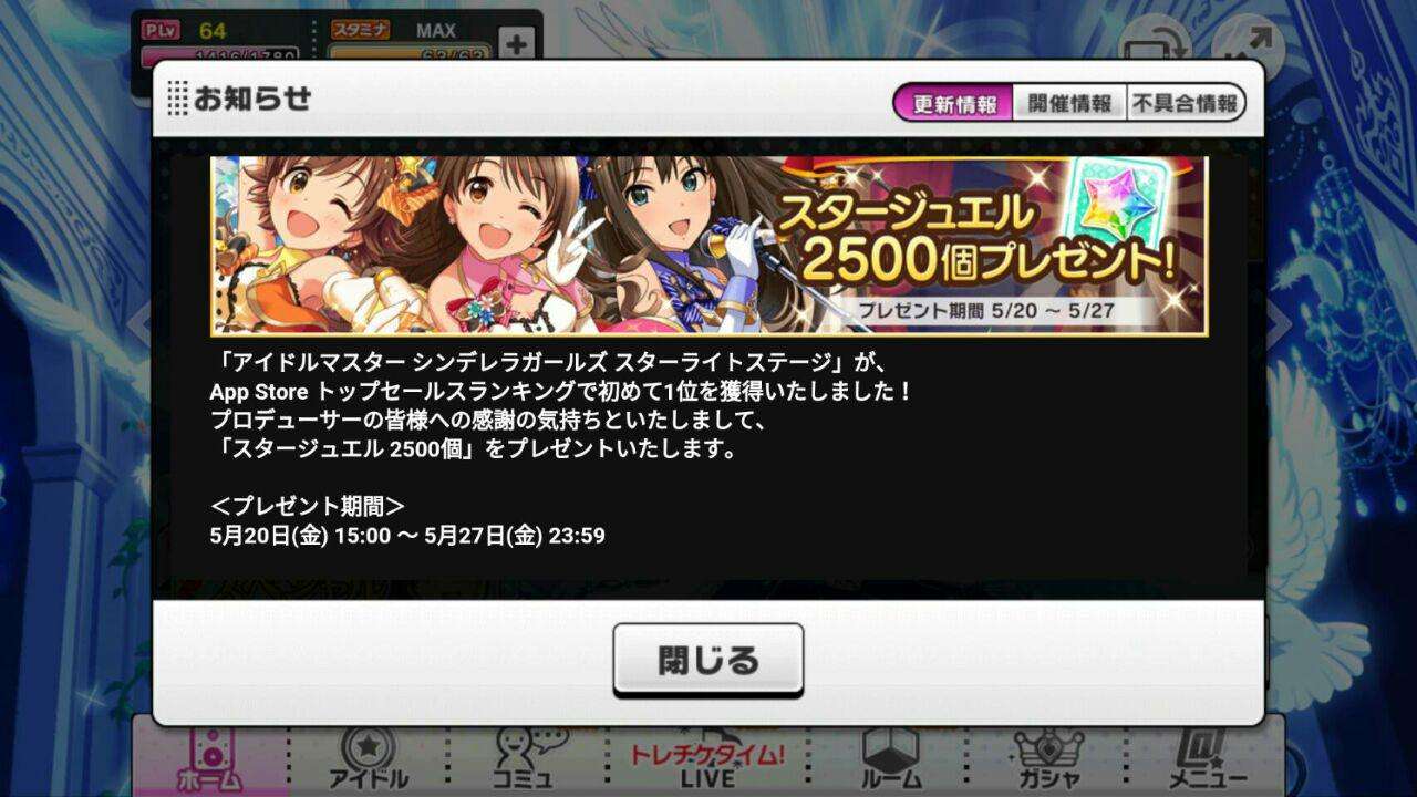 プロデューサーさんへの感謝として、「スタージュエル 2500個」をプレゼントします!#デレステ pic.twitter.com/Razevi4K6g— スターライトステージ (@imascg_stage) May 20, 2016