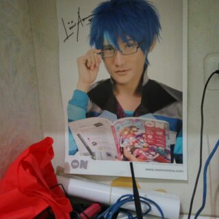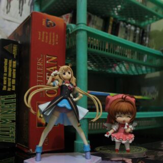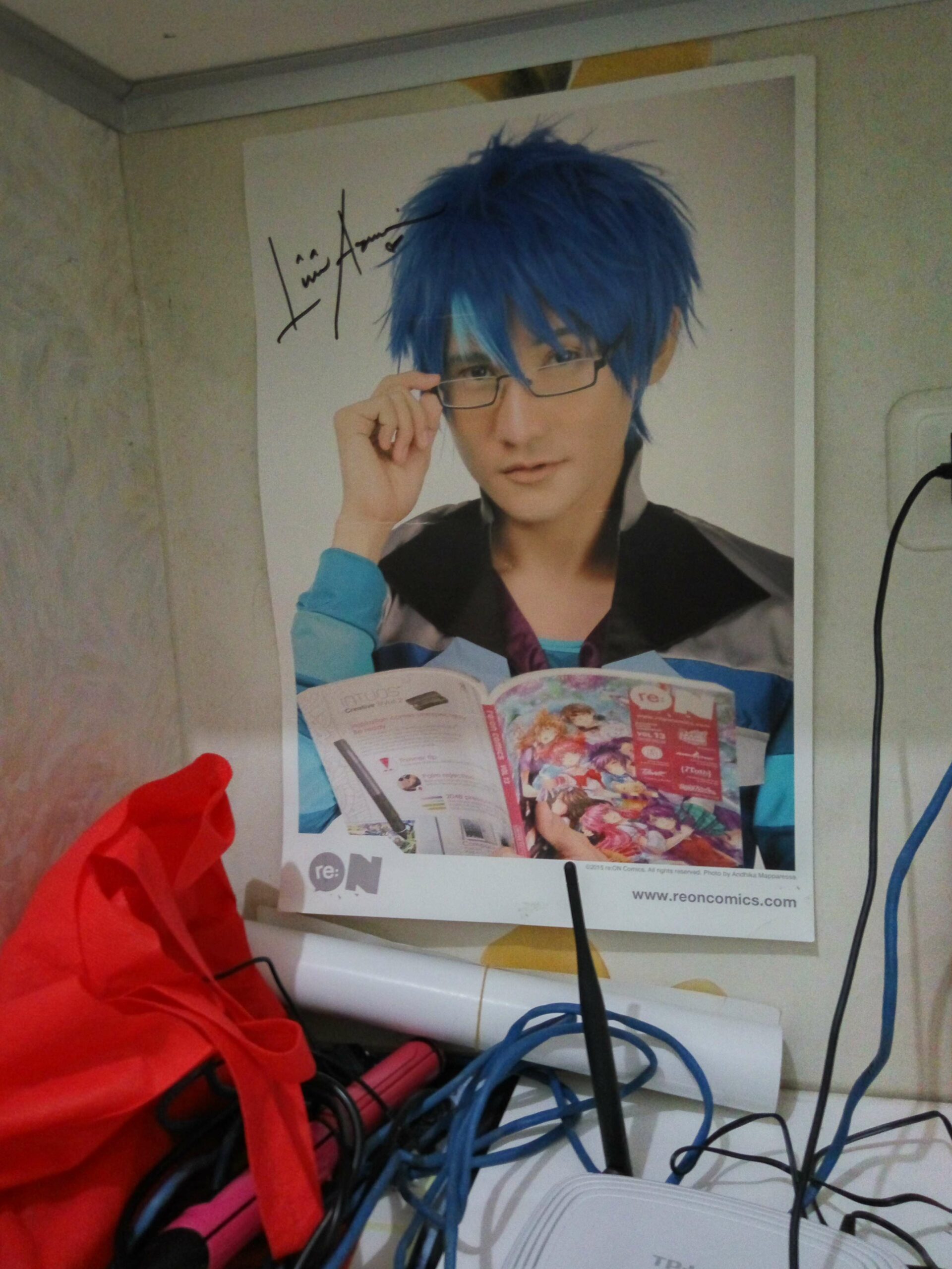 Tidak ada yang mencolok selain mungkin adanya kotak tisu di belakang laptop milik kakak saya (ya ini laptop sebenarnya punya kakak saya namun saya pakai karena ia sudah ga memakai lagi). Tenang-tenang saya ini anak baik-baik serta rajin menabung jadi tisu yang berada di belakang laptop ini digunakan untuk keperluan yang semestinya, seperti membersihkan laptop yang memang sangat cepat kotor karena debu. Oh iya kotak tisu itu juga ditaruh karena saya sangat hobi terjangkit flu jadi ya gitu deh. Ada juga playmat Kill la Kill yang merupakan hadiah ulang tahun saya ke-20 dari toko Aethernity Good Guy Games biasa saya main kartu (Thankies ya Jim!). Di sana juga ada deck case berisi koleksi card game saya, ya saya hobi bermain Magic: The Gathering, Cardfight!! Vanguard, Yu-Gi-Oh!, Weiss Schwarz, serta Wixoss. Selain itu ada juga koleksi board game saya yakni Settlers of Catan, Illuminati dan Mat Goceng. Figur Anzu Futaba yang saya beli dari Dellamarsto Bagus (staf IAT) dan nendoroid Sakura hadiah dari Mangamon menemani hari-hari saya di meja ini. Di ujung meja ini ada juga rak buku sederhana yang berisi komik-komik lokal, photobook re:ON, komik asli dari Jepang, komik Jepang terbitan Indonesia, dan buku non-komik seperti novel dan buku bacaan lainnya, dan beberapa buku ini saya dapat gratis langsung dari penulisnya loh! (seperti buku When a Man Lost a Woman yang saya langsung dapat dari si penulis, Ita Sembiring, namun belum sempat dibaca sih).