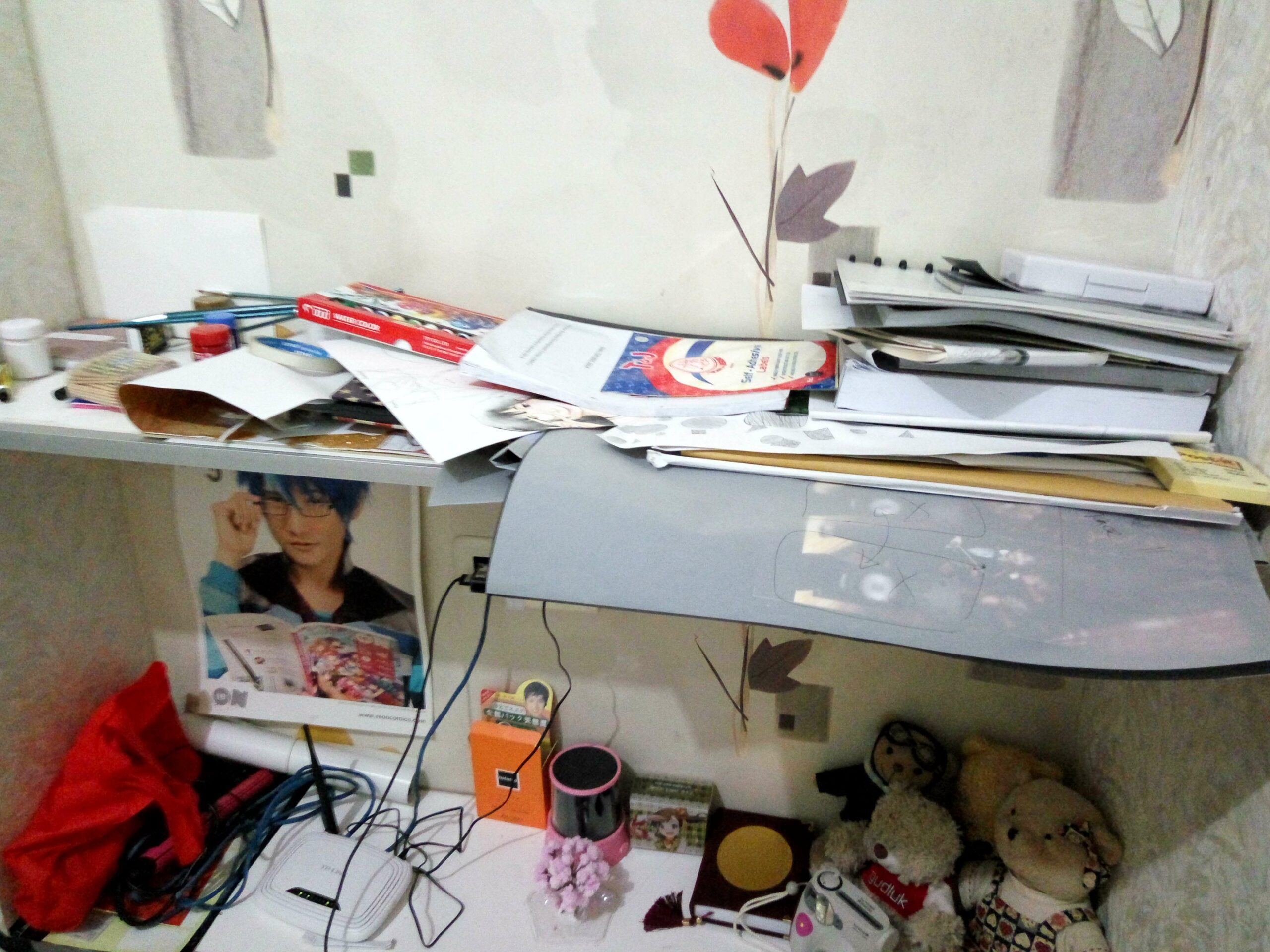 Meskipun terlihat tidak rapi, meja ini baru saja dibersihkan. Meja ini digunakan saat mengerjakan tugas atau membuat artikel. Komputer yang dibelakang biasa digunakan orang tua untuk mengerjakan tugasnya. Kadang juga ku gunakan untuk menyimpan data – data penting karena HDD laptop yang memang hanya tersisa sedikit. Ada headset di sebelah monitor. Headset itu telah lama kupunya, dan memang terlihat sudah tua. Sebenarnya ada meja yang lain. Tetapi meja itu adalah meja untuk mengerjakan tugas yang lain dan tempat buku – buku pelajaran. Mengapa wallpapernya Tamamo? karena ku suka Tamamo (>^-^<)