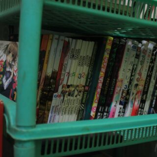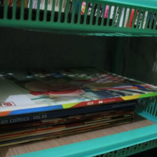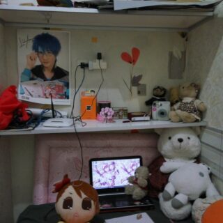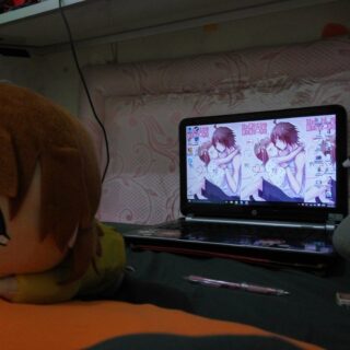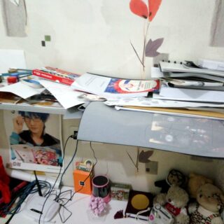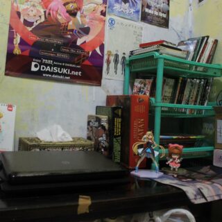 Meja kerjaku? Ya … meja. Cuma meja kayu tua cokelat ke-hitaman. Agak usang dan ditempeli stiker-stiker Spongebob di sana-sini. Gaming desktop–ya, isinya, sih, ada lagu sama ebook, (tapi kebanyakan game-nya). Apa lagi? Oh, dan kumpulan novel & komik Jepang di rak buku oranye itu. Buku-buku yang lain ada di lemari bawah–tahulah, buku-buku akademik anak kuliahan. Juga ada tiga figurin di atas meja yang biasanya aku ajakin ngobrol kalau lagi nulis malam-malam. Jadi … ya itu. Meja. Nggak otaku banget, kan? Duh.
