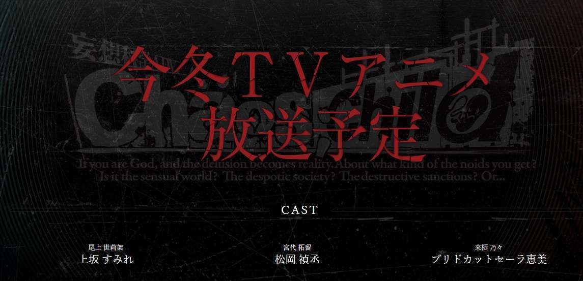 Salah satu judul game dari seri Scientific Adventure besutan 5pb. Games dan MAGES, Chaos;Child akan diadaptasi menjadi serial anime. Terkait dengan rencana adaptasi anime dari game yang menjadi sekuel dari Chaos;Head tersebut, informasi terbaru telah dirilis. Laman resmi anime ini telah merilis informasi mengenai pengisi suara serta studio animasi yang akan mengadaptasi anime ini.