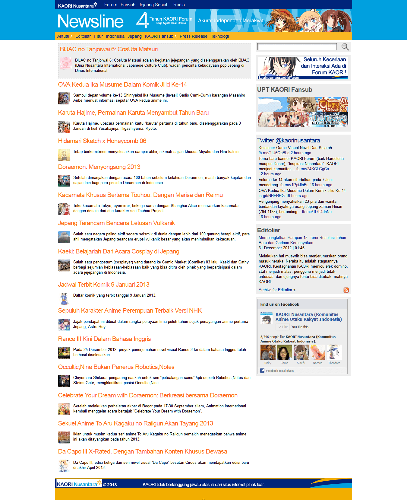 Selamat datang dalam desain baru KAORI Newsline. Bila Anda selama ini mengakses Newsline secara rutin sejak 2008, mungkin akan merasakan banyak perubahan (yang mungkin terlihat radikal) dari masa ke masa. Bila ini awal Anda mulai mengakses KAORI Newsline, selamat datang! Lalu bila Anda mulai mengakses Newsline sejak revitalisasi Newsline dimulai (kira-kira dimulai awal Desember 2012 lalu), maka Anda akan melihat perubahan-perubahan kecil, evolusioner, hingga Newsline tampil seperti yang Anda lihat hari ini.