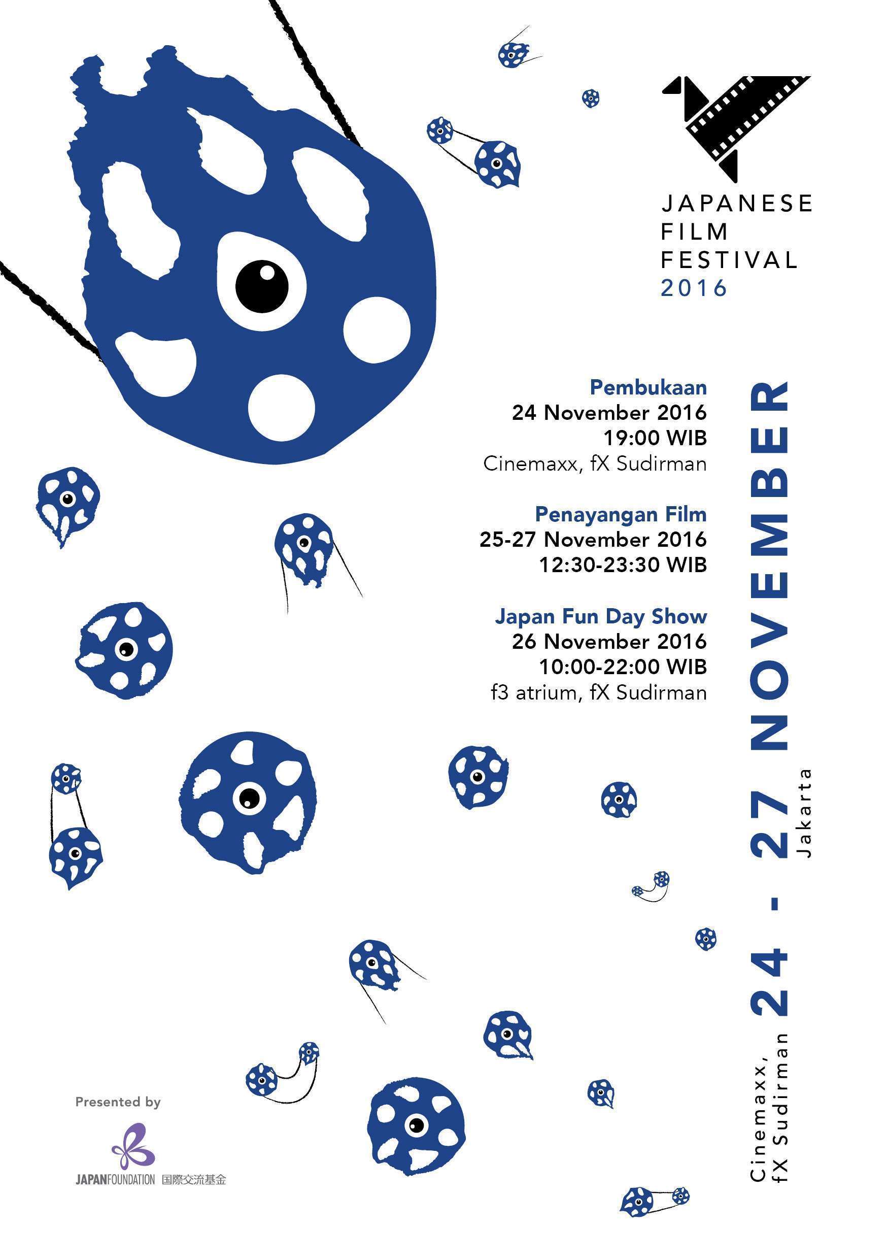 Japanese Film Festival (JFF) akan hadir kembali di Jakarta. JFF adalah sebuah platform film Jepang yang bertujuan untuk meningkatkan minat terhadap film Jepang dan menarik penonton yang luas di negara-negara Asia Tenggara. JFF Indonesia pertama kali diselenggarakan pada tahun 2015 oleh Agency for Cultural Affairs of Japan bekerja sama dengan Kedutaan Besar Jepang di Indonesia, Japan Foundation, dan Japan Image Council. Mulai tahun ini, JFF Indonesia akan tergabung dalam JFF Asia Pacific Gateway yang diinisiasi oleh Japan Foundation dan diselenggarakan di 10 negara Asia Tenggara dan Australia. Sebanyak 14 film Jepang terbaru yang rilis pada tahun 2015-2016 dari berbagai genre akan meramaikan JFF Indonesia. JFF diharapkan menjadi jembatan antara film Jepang dan penikmatnya dengan menghadirkan beragam kegiatan berkaitan dengan film pada khususnya dan kebudayaan Jepang secara umum.