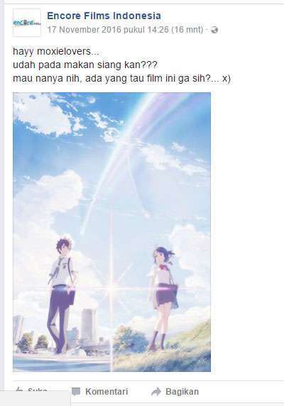 Penggemar berat film Makoto Shinkai your name. (Kimi no Na wa.) akan terhenyak melihat kode ini. Encore Films, salah satu distributor film impor di Indonesia memosting poster film tersebut.