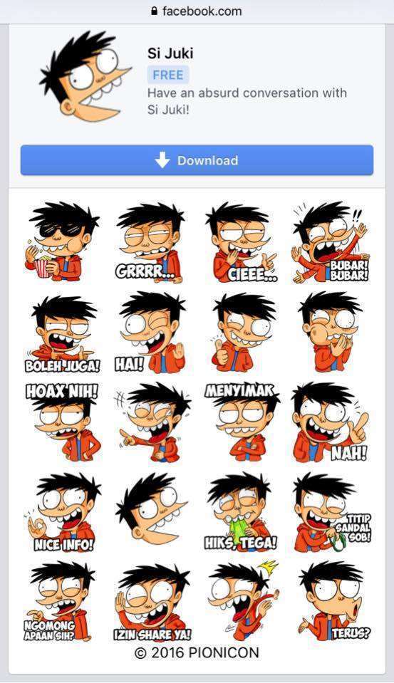 Stiker Si Juki yang bisa digunakan untuk mengirim pesan melalui aplikasi Facebook Messenger maupun berkomentar di Facebook ini bisa diunduh secara gratis melalui tautan berikut ini.