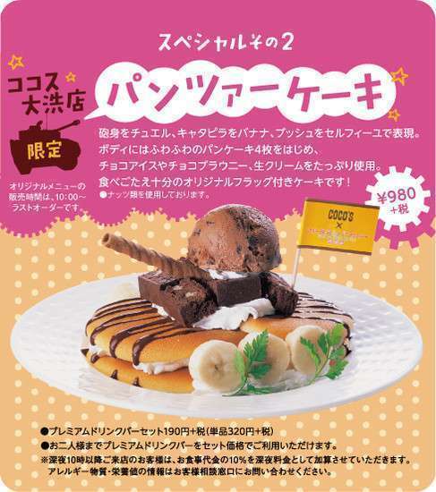Beberapa resto Coco’s yang terpilih di Jepang akan menampilkan Cutout ukuran 1:1 dari karakter Girls und Panzer. Resto Coco’s Oarai, Ibaraki – yang tampil di dalam filmya – akan dihiasi dengan berbagai macam pernik kolaborasinya. Sebagai tambahan, sebuah menu penutup berbentuk tank Panzer dapat dipesan di restoran tersebut.