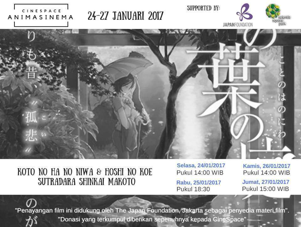 Pihak The Japan Foundation Jakarta mengumumkan acara pemutaran film animasi karya sutradara Makoto Shinkai. Melalui laman resmi Facebook miliknya pihak The Japan Foundation mengumumkan kolaborasi bersama CineSpace untuk acara yang diselenggarakan pada tanggal 24-27 Januari 2017. Dalam acara ini dihadirkan pemutaran dua film karya Makoto Shinkai yakni Koto no Ha no Niwa (A Garden of Words) serta Hoshi no Koe (Voices of a Distant Star).