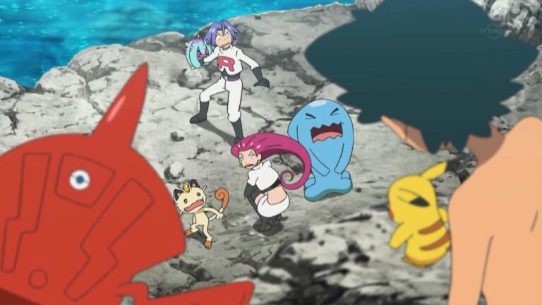 Di sisi lain Tim Roket yang tengah beristirahat di sarang Bewear (Kiteruguma dalam versi Jepangnya) tiba-tiba mendapat panggilan dari sang bos, Giovanni (Sakaki dalam versi Jepangnya). Giovanni menanyakan perkembangan misi yang diemban oleh Jessie (Musashi dalam versi Jepangnya) serta James (Kojiro dalam versi Jepangnya) yang lama tidak memberikan laporan setelah tiba di Alola. Karena teguran dari sang bos, Tim Roket pun segera menuju pantai di pulau Melemele untuk mencari Pokemon yang bisa mereka tangkap.