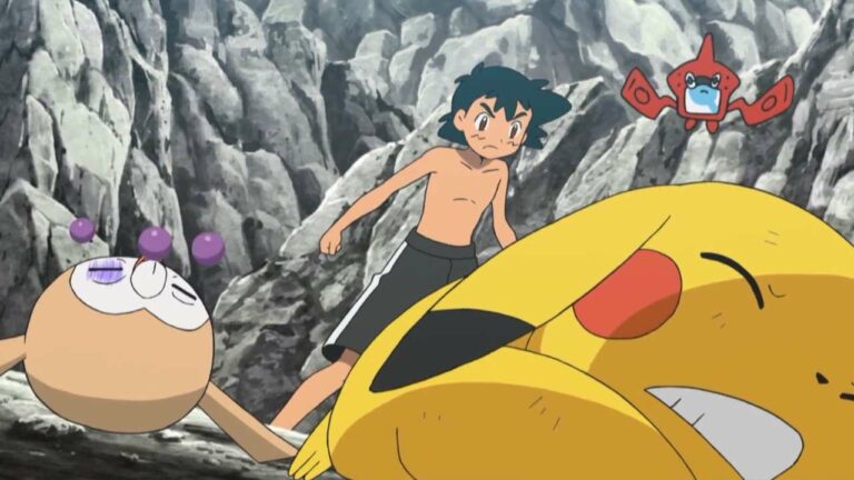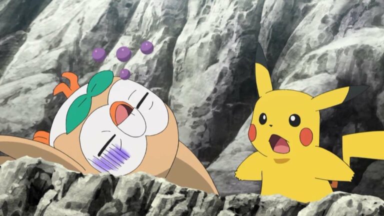 Tak lama kemudian Tim Roket pun bertemu dengan Ash di pantai tersebut. Tanpa pikir panjang pertempuran pun langsung terjadi antara Ash melawan Tim Roket. Ash menggunakan Rowlet (Mokuroh dalam versi bahasa Jepang) dan Pikachu untuk melawan Tim Roket yang menggunakan Mimikyu dan Mareanie yang jatuh hati kepada James.