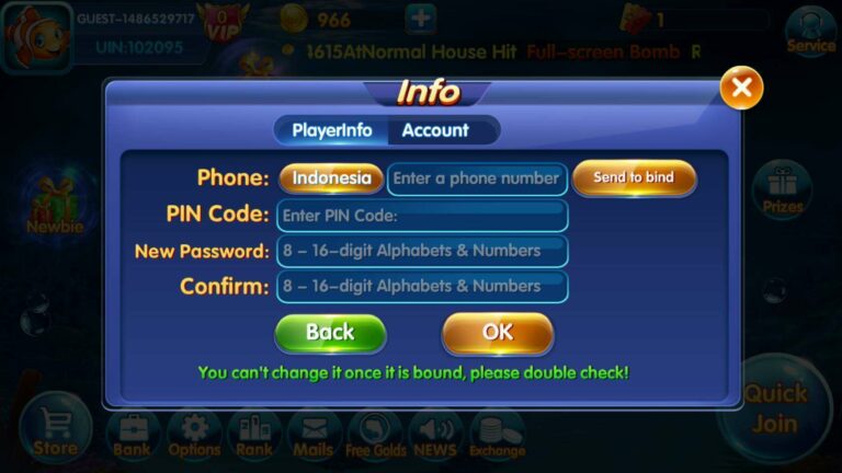 Hubungkan akun Crazy Fish ke media sosial (facebook atau nomor telepon) agar history permainan tetap tersimpan. System ini juga berfungsi untuk menyimpan data permainan agar saat player bermain lagi tidak mengulang game.