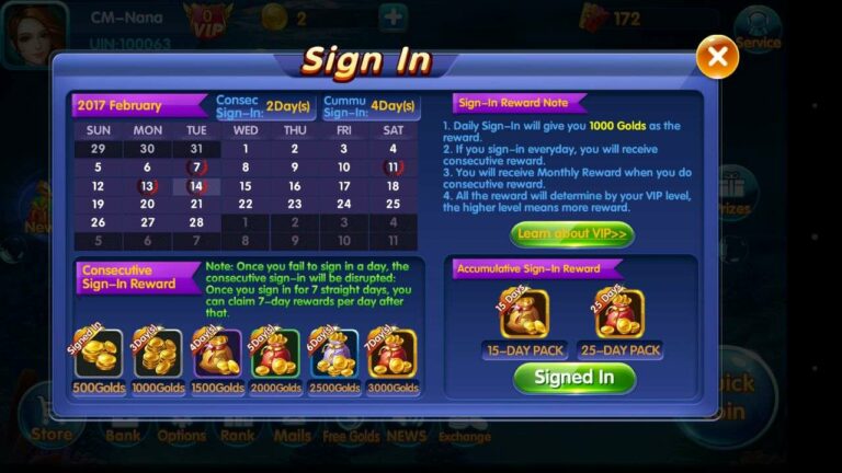 Player akan mendapatkan 1000 gold setiap melakukan Daily Sign In. Apabila player login setiap hari dengan rutin, akan ada reward tambahan. Reward bulanan juga akan diberikan bila player rutin login setiap hari. Level VIP juga menentukan banyaknya reward daily yang kalian dapatkan.