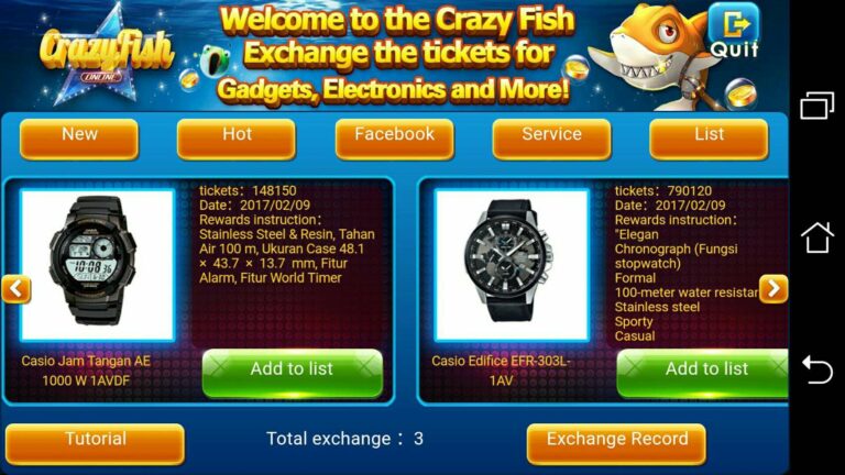 Main game gratis dan dapat hadiah? Siapa sih yang ga mau. Di Crazy Fish ada fitur Exchange Reward dimana player bisa menukarkan ticket yang didapatkan dengan hadiah-hadiah yang menarik dan GILA pastinya.