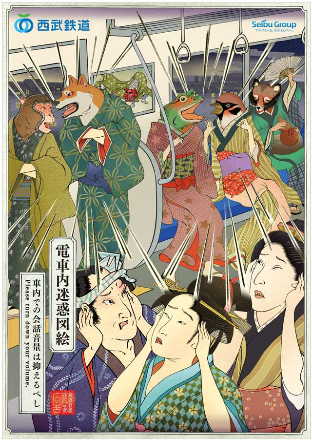 Kali ini giliran Seibu Railway yang mengeluarkan seri manner poster. Bertema gambar bergaya Jepang abad ke-19, poster ini bertema 電車内迷惑図絵 (densha-nai meiwaku zue, gambar-gambar kegiatan mengganggu dalam kereta). Misalnya, poster himbauan duduk ini.