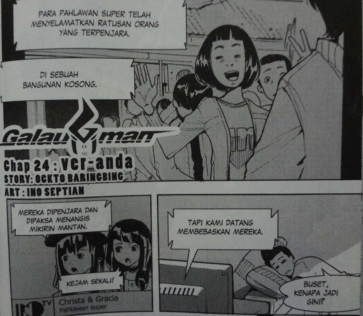 Masih ingat dengan Veranda? Mbak reporter dari bab 5 yang mendapat cerita khusus di komik satuan Galauman ini kini hadir kembali ke kehidupan Gabriel dengan bantuan para bocah caper. Ingin membuntuti Gabriel agar bisa terus mendapatkan rekaman aksi Galauman, Veranda punya timbal balik yang bisa ia tawarkan. Bahasa tubuh Veranda dengan baik menggambarkan kepedean untuk menguasai situasi. Tapi apakah ada potensi kerja sama yang ia tawarkan akan menjadi bumerang?