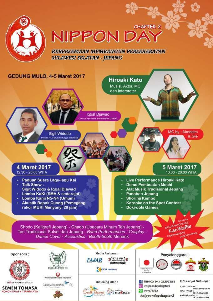 Beragam kebudayaan Jepang dari Tradisional sampai Pop ada disini. Tidak seperti festival Jepang lain di Indonesia yang kebanyakan berfokus pada Pop Culture, Nippon Day hadir memperkenalkan Jepang yang sesungguhnya pada masyarakat Kota Daeng di mana ada keramahan, kerjasama juga perhatian dalam setiap hal yang dilakukan. ada beberapa acara inti pada hari kedua staff kami tidak bisa liput karena menghadiri meet and greet dengan Hiroaki Kato.