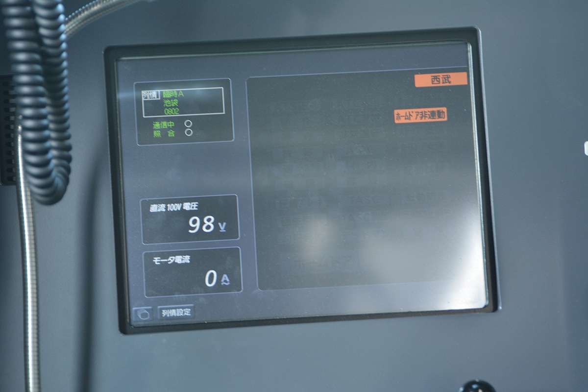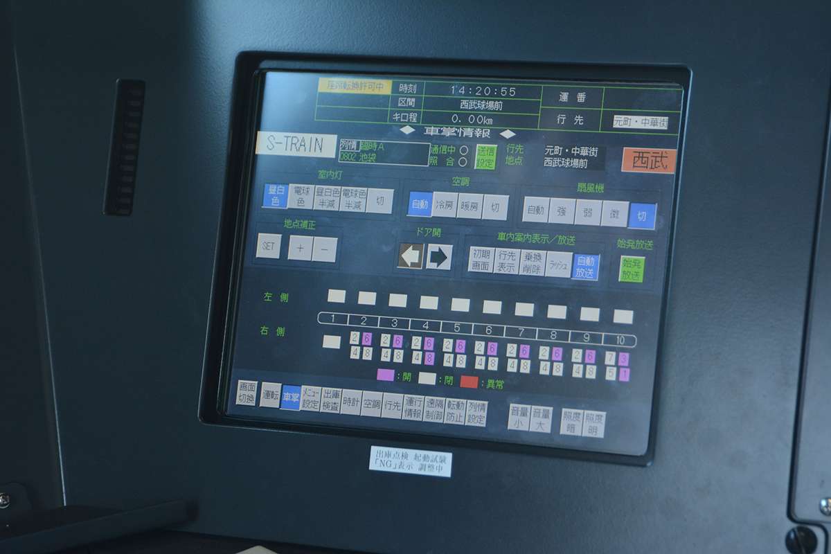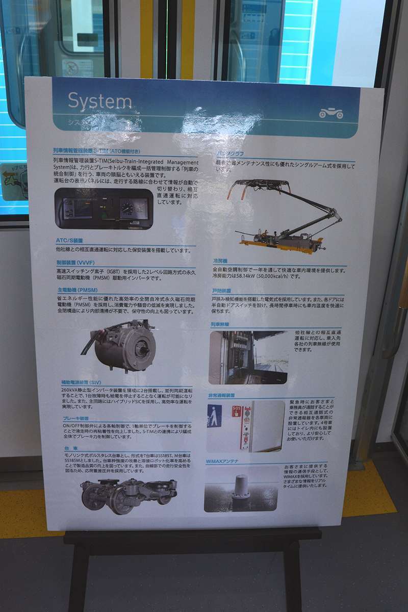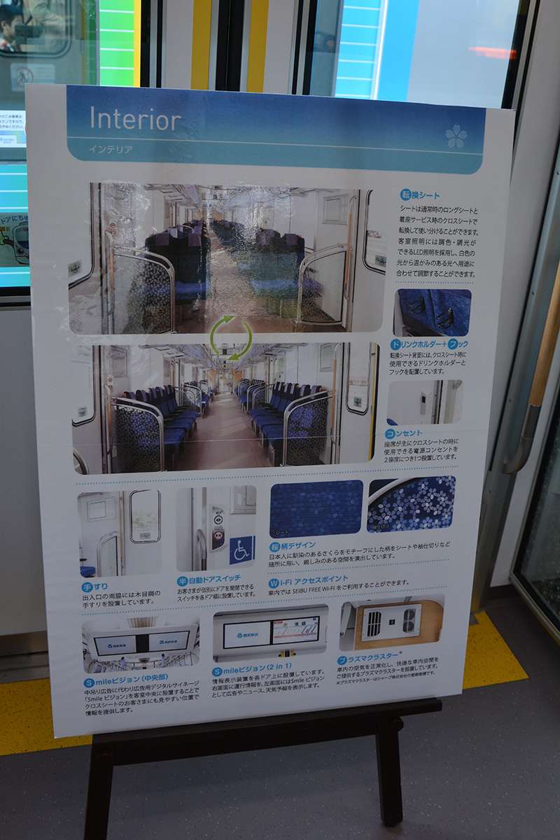 Saat tim KAORI memasuk kereta nomor 1, Seibu sedang mendemonstrasikan pergantian warna pencahayaan interior yang dilakukan pada saat KRL ini merubah layanannya. Contohnya, bila KRL ini beroperasi untuk layanan S-Train maka lampu LED yang terpasang pada KRL ini akan berubah menjadi warna kuning yang hangat.