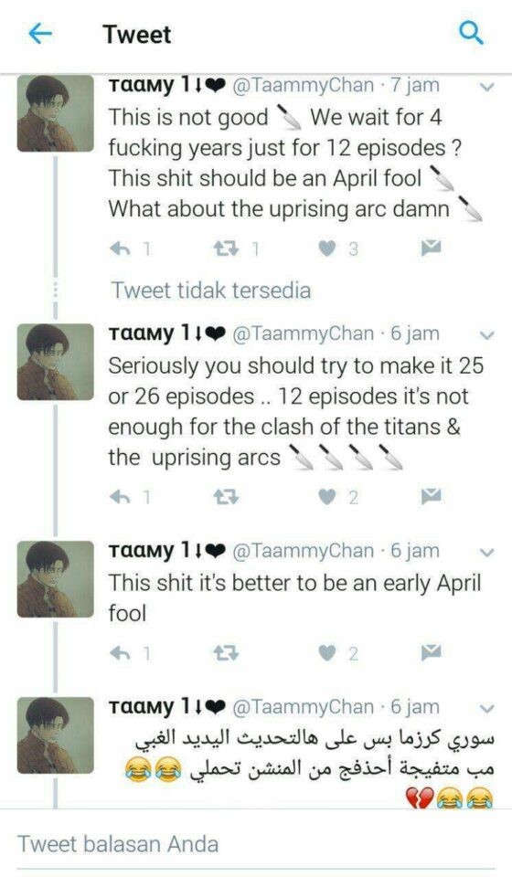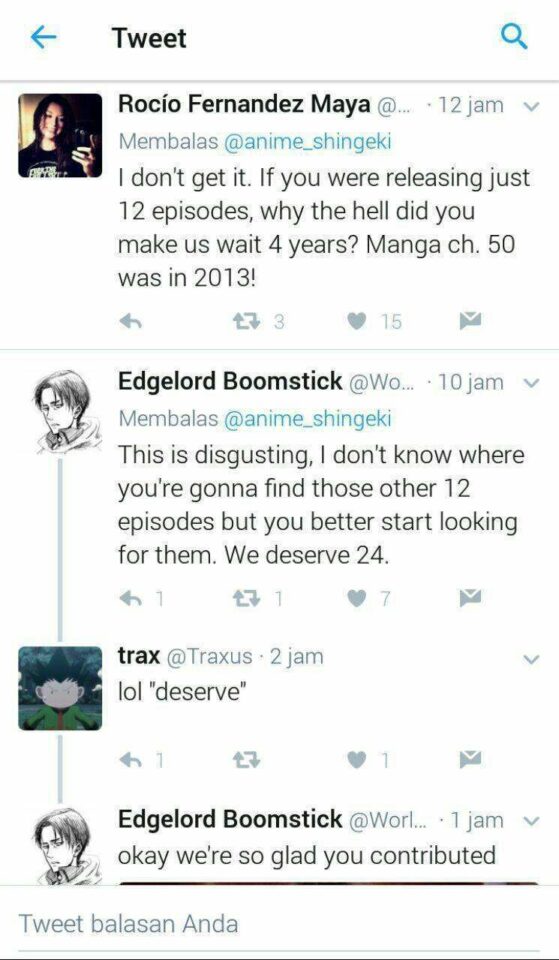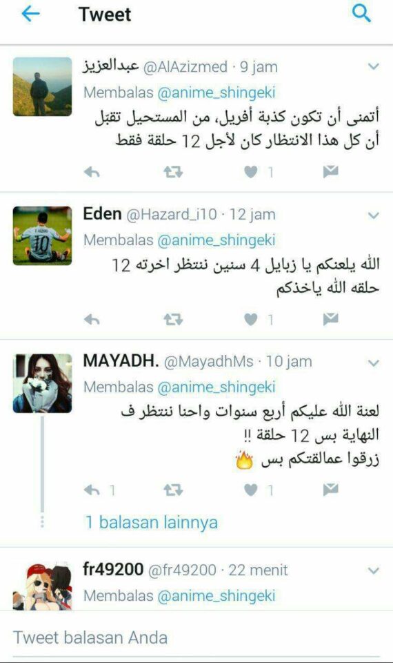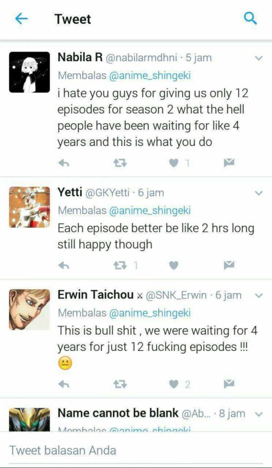 Sontak saja banyak netizen menyampaikan rasa kecewa dan marah, karena setelah menunggu 4 tahun, mereka harus menerima kabar bahwa anime adaptasi manga karya Hajime Isayama tersebut hanya berjalan sebanyak 12 episode, tidak seperti musim pertamanya yang berlangsung sebanyak 26 episode. Menurut pengamatan saya, kemarahan tersebut ternyata bukan berasal dari Jepang namun berasal dari netizen global.