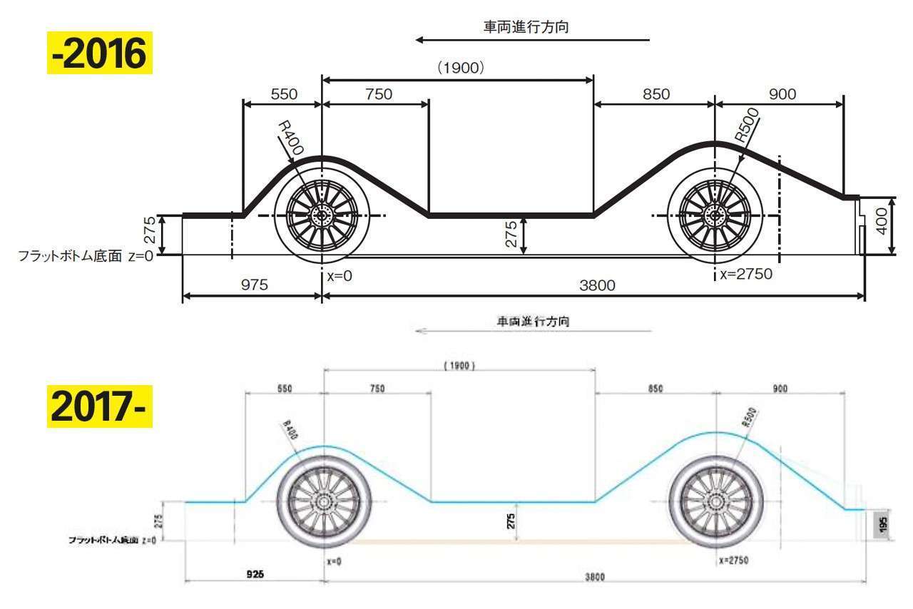 Berbagai aturan dalam regulasi paket aerodinamika yang berubah untuk musim 2017 adalah ukuran panjang mobil yang semakin pendek (dari 4.775 mm menjadi 4.725 mm), jarak front overhang (bagian sasis yang menggantung di sisi depan poros roda) semakin dekat (dari 975 mm menjadi 925 mm), tinggi bagian belakang mobil semakin rendah (dari 400 mm menjadi 195 mm), tinggi bagian rear diffuser semakin rendah (dari 206 mm menjadi 101 mm) dan ukuran panjang sayap yang semakin lebar (dari 1.390 mm menjadi 1.900 mm).