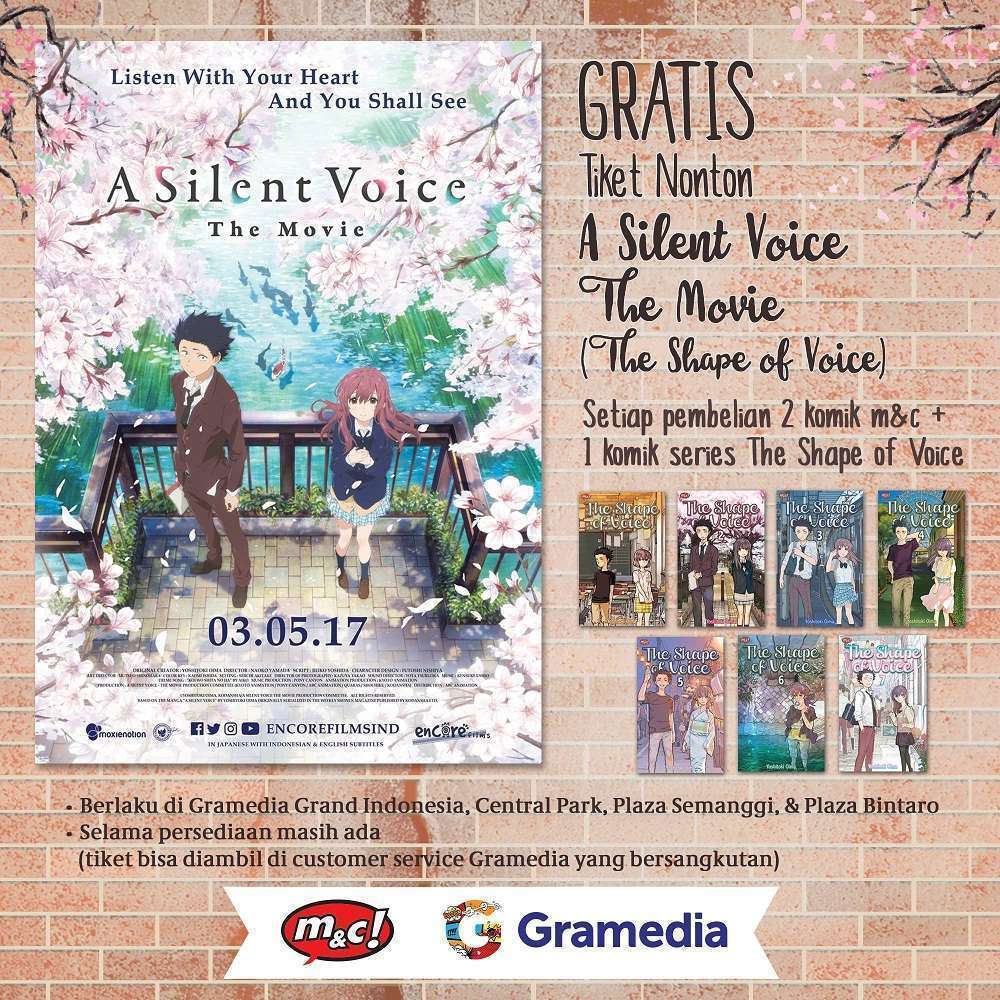 Setiap pembelian dua komik m&c ditambah salah satu volume dari seri komik The Shape of Voice akan mendapatkan satu tiket gratis untuk menonton film A Silent Voice. Promo ini berlaku di toko buku Gramedia cabang mal Grand Indonesia, Central Park, Plaza Semanggi, dan Plaza Bintaro.