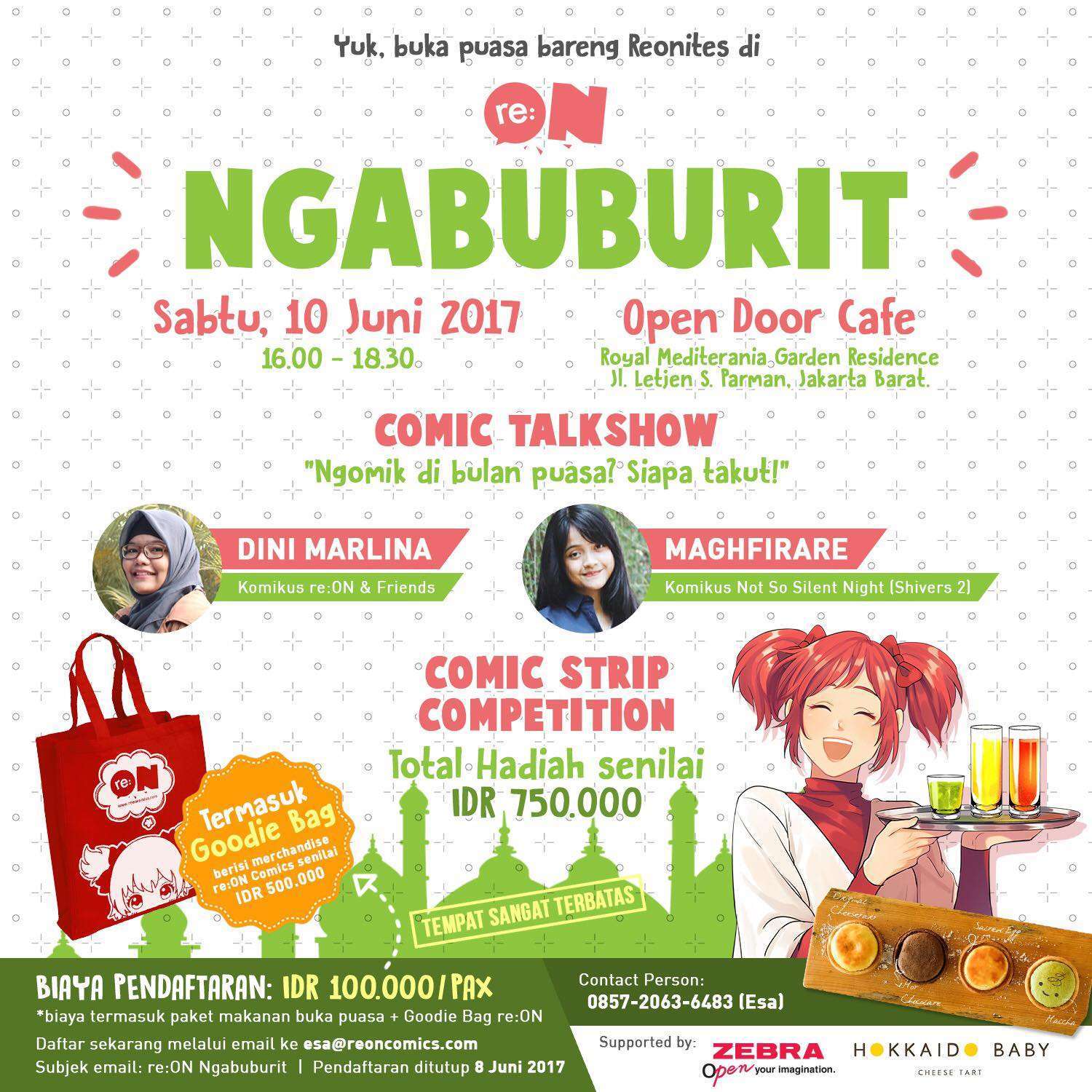 Re:ON Ngabuburit adalah acara buka bersama yang diadakan oleh pihak re:on Comic spada hari Sabtu, 10 Juni 2017. Acara akan dilaksanakan pukul 16:00 – 18:30 WIB di Open Door Café, Royal Mediterania Garden Residence Lobby, Jl. Letjen S. Parman Kav. 28, Jakarta Barat.