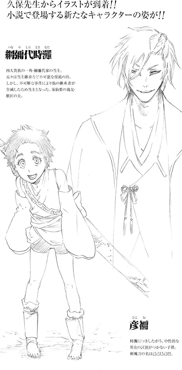 Kedua karakter itu ialah Hikone (sebelah kiri) dan Tokinada Tsunayashiro (sebelah kanan). Hikone adalah anak yang cantik yang selalu mengikuti Tokinada. Ia mempunyai kemampuan bertarung yang sangat baik, namun karakter aslinya belum diketahui dengan jelas. Tokinada adalah kepala keluarga Tsunayashiro yang baru, yang merupakan salah satu dari empat keluarga bangsawan. Dia adalah suami dari teman dekat Kaname Tousen, Kakyou yang juga dibunuhnya.
