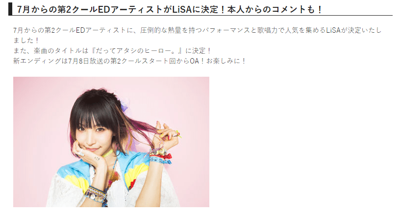 Seri anime My Hero Academia akan menghadirkan penyanyi lagu tema baru. Dilansir dari situs resminya, LiSA akan menyanyikan lagu “Datte Atashi no Hero (Still My Hero)” sebagai lagu penutup kedua dari seri anime ini.