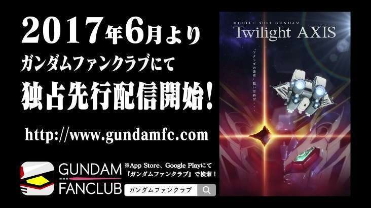 Sebagaimana telah diberitakan sebelumnya, Gundam Twilight AXIS, novel Gundam karya Ark-Performance dan Koujirou Nakamura akan diadaptasi menjadi anime. Anime ini telah memulai debutnya pada 23 Juni 2017 melalui kanal Youtube GundamInfo, dan dapat disaksikan pada video berikut ini: