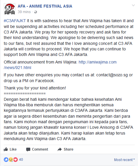 Melalui laman Facebook resminya, pihak penyelanggara C3 AFA Jakarta 2017 telah mengkonfirmasi mengenai Ami Wajima yang batal tampil di acara tersebut. Adapun untuk penggantian artis maupun hal lain yang menyangkut tentang penyelengaraan konser “I Love Anisong” masih belum ada informasi lebih lanjut sampai saat ini.