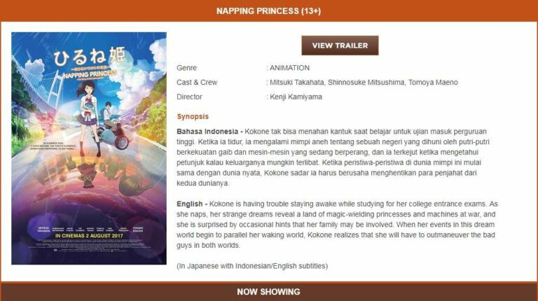 Jaringan bioskop Cinemaxx akan memutar film anime Napping Princess. Rencananya film ini akan mulai diputar pada 2 Agustus 2017 mendatang.