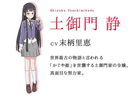 Rie Suegara sebagai Shizuka Tsuchimikado, gadis yang dipilih oleh cerita Putri Kaguya yang merupakan salah satu cerita rakyat tertua. Dia mewarisi cerita tersebut sebagai keturunan Tsuchimikado. Shizuka sendiri merupakan pribadi yang sangat serius dan pekerja keras.