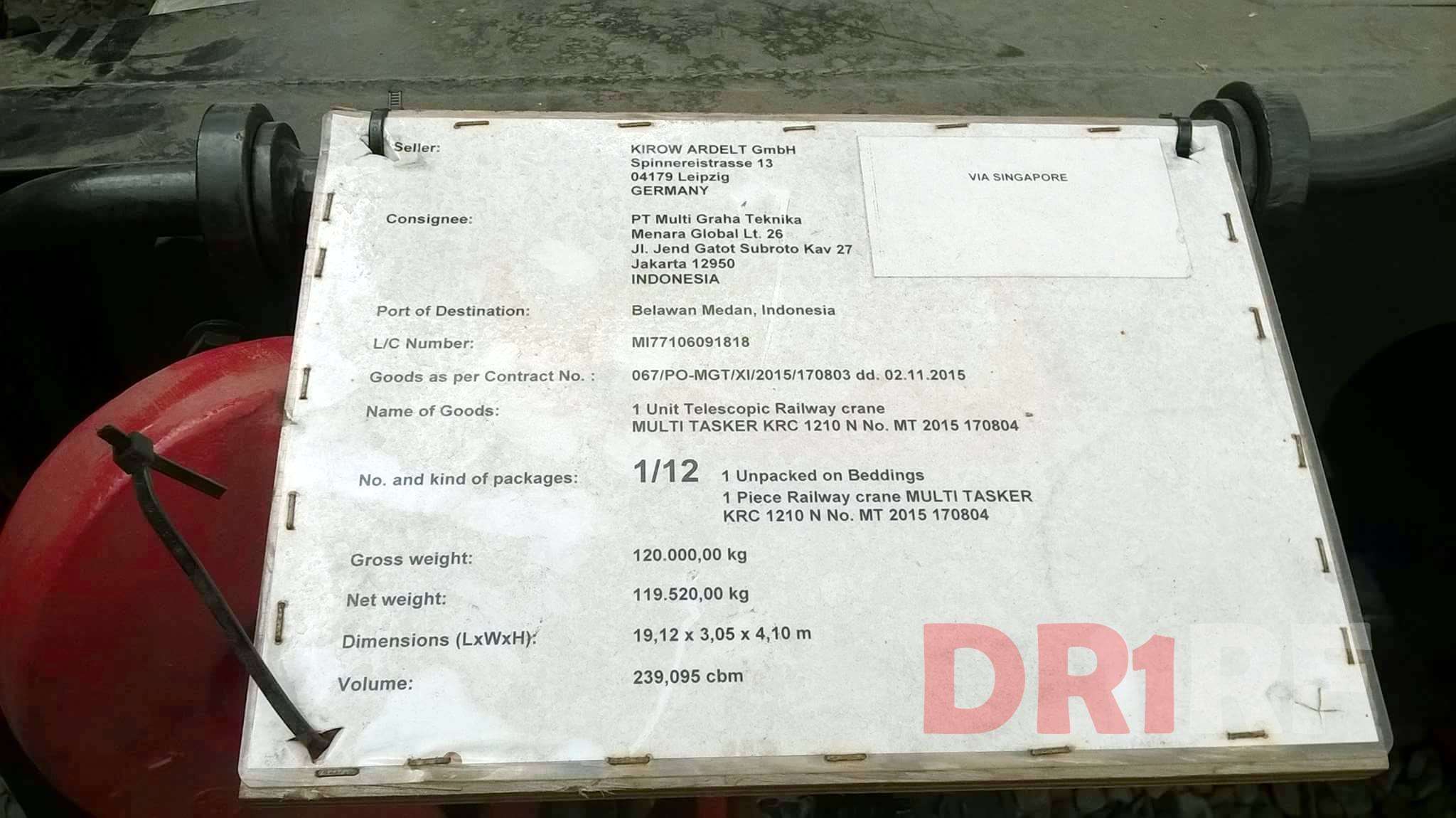 Sesuai dengan rilis resmi dari Kirow, Crane Multitasker 1210N pesanan DitjenKA tiba di Pelabuhan Belawan, Medan, Sumatera Utara pada Jum’at pagi (4/8). Namun, dengan berat total Crane yang mencapai 150 ton (mendekati berat 2 unit lokomotif kelas CC206, dimana berat satu lokomotif mencapai 80 Ton), proses bongkar muat derek berjalan cukup alot hingga Crane tersebut baru dapat diturunkan dari truk multi axle menuju rel di pelataran dermaga pelabuhan Belawan pada sore harinya.