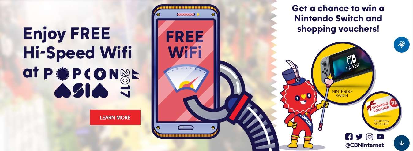 Selain menyediakan koneksi internet dedicated dengan kecepatan sampai dengan 1Gbps, CBN juga menyediakan jaringan FREE WIFI secara unlimited di seluruh acara Popcon Asia 2017 yang dapat dinikmati oleh pengunjung. Para pengunjung juga berkesempatan untuk memperoleh hadiah Nintendo Switch dan voucher belanja dari CBN hanya dengan posting video di media sosial selama Popcon Asia 2017 serta promo acara-acara menarik dan promo fantastis di booth CBN.