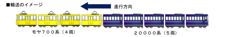 Menempuh perjalanan sepanjang 950 km, KRL seri 20000 rangkaian 20001F mengembara ke barat Pulau Honshu via jalur JR Sagami dengan ditarik menggunakan lokomotif listrik tipe EF 66 milik JR Freight sampai Stasiun Atsugi yang merupakan terminus dari jalur KA Barang milik Sotetsu. Dari Stasiun Atsugi, “NR” milik Sotetsu, MoYa seri 700, bertugas menggantikan lokomotif EF66 untuk mengantarkan KRL dengan formasi 10 kereta per rangkaiannya ini menuju Balai Yasa Kashiwadai. Namun, dikarenakan keterbatasan panjang peron, pengiriman KRL seri 20000 yang ditarik MoYa 700 ini harus dibagi menjadi dua kali pengiriman.