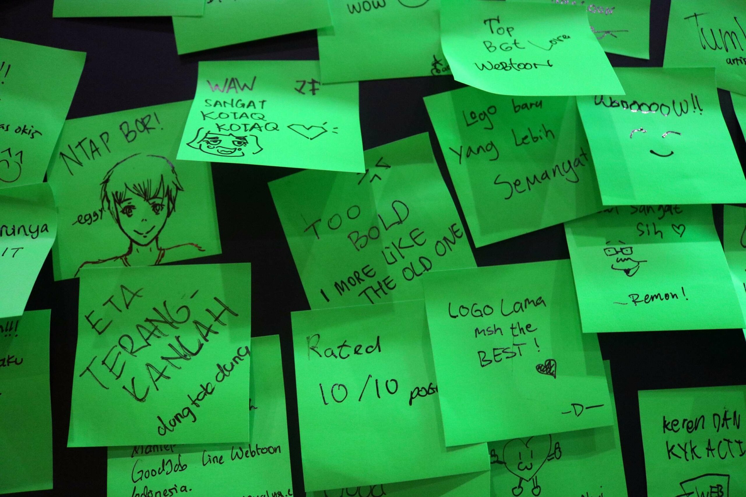 Hal yang menarik, booth Webtoon memajang sebuah dinding yang memungkinkan para pengunjung untuk menuliskan komentar mereka tentang logo baru tersebut. Para pengunjung yang menghadiri acara ini terlihat antusias memberikan komentar mereka, dilihat dari banyaknya sticky notes yang banyak terpajang di dinding tersebut. Sebagian besar menyampaikan respon positif terhadap logo baru tersebut.