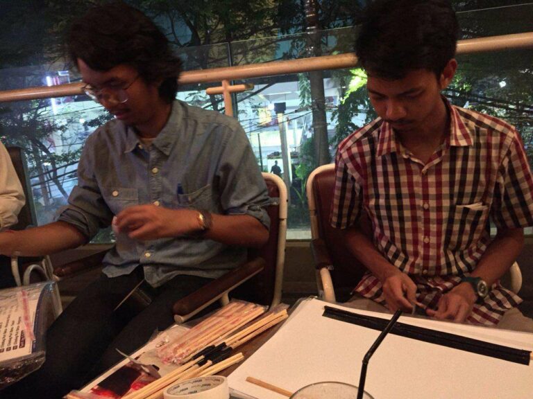 Saat kami menemui Yasin, tampak sejumlah sumpit baru berderet-deret di atas meja. Rupanya, sumpit ini akan direkatkan dengan lakban hitam di bagian belakang peta yang telah dilaminasi. Tujuannya, supaya peta tidak ngewer-ewer, melengkung tertiup kencangnya angin malam.