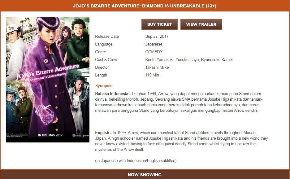 Sebagaimana telah diberitakan sebelumnya, film live action JoJo’s Bizarre Adventure: Diamond is Unbreakable diputar di Indonesia mulai 27 September 2017. Jaringan bioskop CGV Cinemas Indonesia turut memutar film ini. Selain itu jaringan bioskop Cinemaxx juga turut memutar film ini.