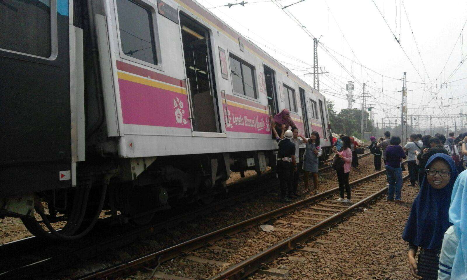 Dua gandar dari kereta paling belakang (6106/K1 1 12 61) keluar dari rel saat melewati wesel pemisah jalur 3 dengan jalur 2 dan jalur 1 stasiun Manggarai.