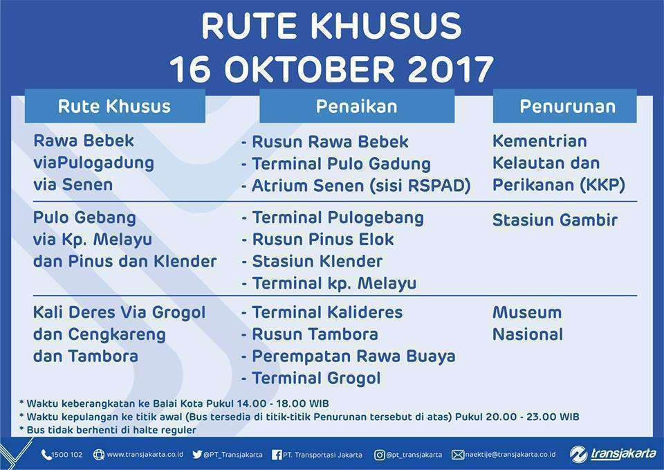 Armada gratis ini akan berjalan di rute khusus dengan tempat penaikan tertentu dan tidak berhenti di halte reguler. Waktu keberangkatan ke balai kota dari rute-rute khusus ini mulai pukul 14.00-18.00 WIB dengan waktu kepulangan ke titik awal pukul 20.00-23.00.