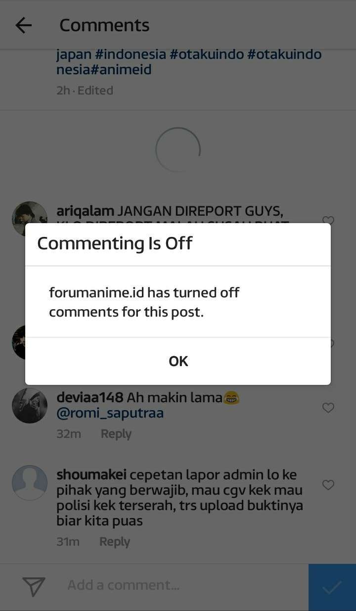 Sayangnya, setelah di-refresh beberapa kali, pada pukul 2319 WIB akun tersebut menonaktifkan kolom komentar pada post tersebut. Hal itu membuat seluruh komentar, termasuk pernyataan dan permintaan maaf yang sudah mereka sampaikan pada post mereka tersebut kini terhapus. Staf kami sempat menyimpan bukti notifikasi saat kolom komentar dalam post tersebut dinonaktifkan.