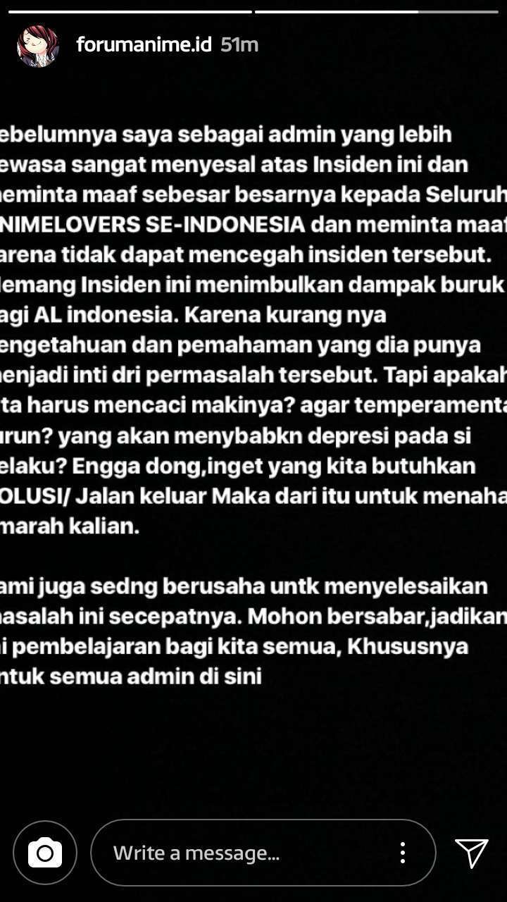 Beberapa jam setelahnya, tepatnya pada Senin dinihari (30/10), salah satu pengurus akun forumanime.id lainnya yang mengaku lebih dewasa menyampaikan sebuah pernyataan permintaan maaf melalui fitur Instagram Story mereka. Ia menyesalkan insiden yang dilakukan oleh salah satu pengurus lainnya (yang merekam film) hingga membuat publik penggemar anime di Indonesia mengalami kerugian. Ia mengklaim bahwa pengurus lain yang merekam film No Game No Life: Zero tersebut kurang memiliki pengetahuan tentang pembajakan.